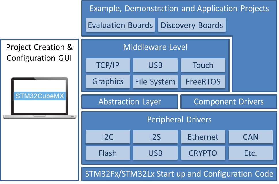 As would be expected, the STM32Cube embedded software is structured into a set of layers of increasing abstraction: Start up code and low level hardware interfaces are found in the bottom layer, and pre-configured examples are found in the top layer - with peripheral drivers, component drivers and middleware found in the layers in between. Each layer uses the interfaces provided by the layer below it - with the abstraction layer ensuring portability across STM32 ARM Cortex-M device families.