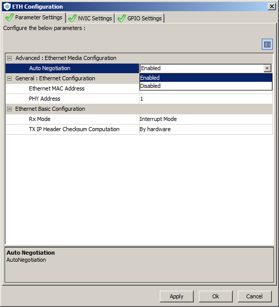 2. If the selected peripheral has user configurable parameters then the parameters will be displayed in, and can be edited using, the "Parameter Setting" tab. Where applicable, the editor will guide your selections by displaying drop down lists of available options - and providing a description of the parameter at the bottom of the dialogue.