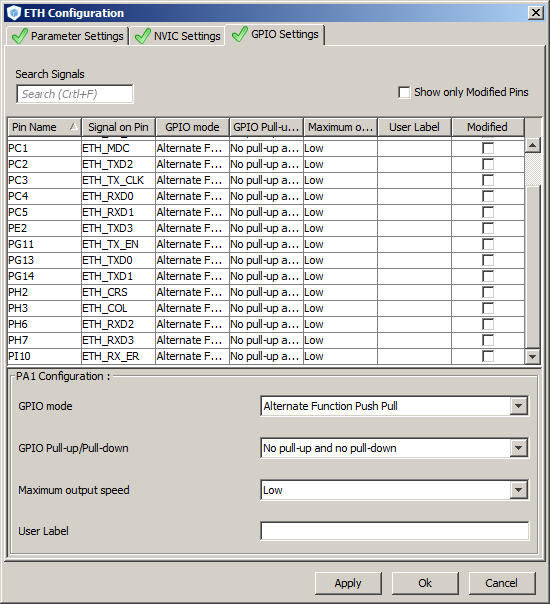4. View the "GPIO Settings" tab. The pins used by the peripheral can be configured and named from here. The pins used by a dedicated peripheral (such as the Ethernet ETH) will already be configured correctly for that peripheral.