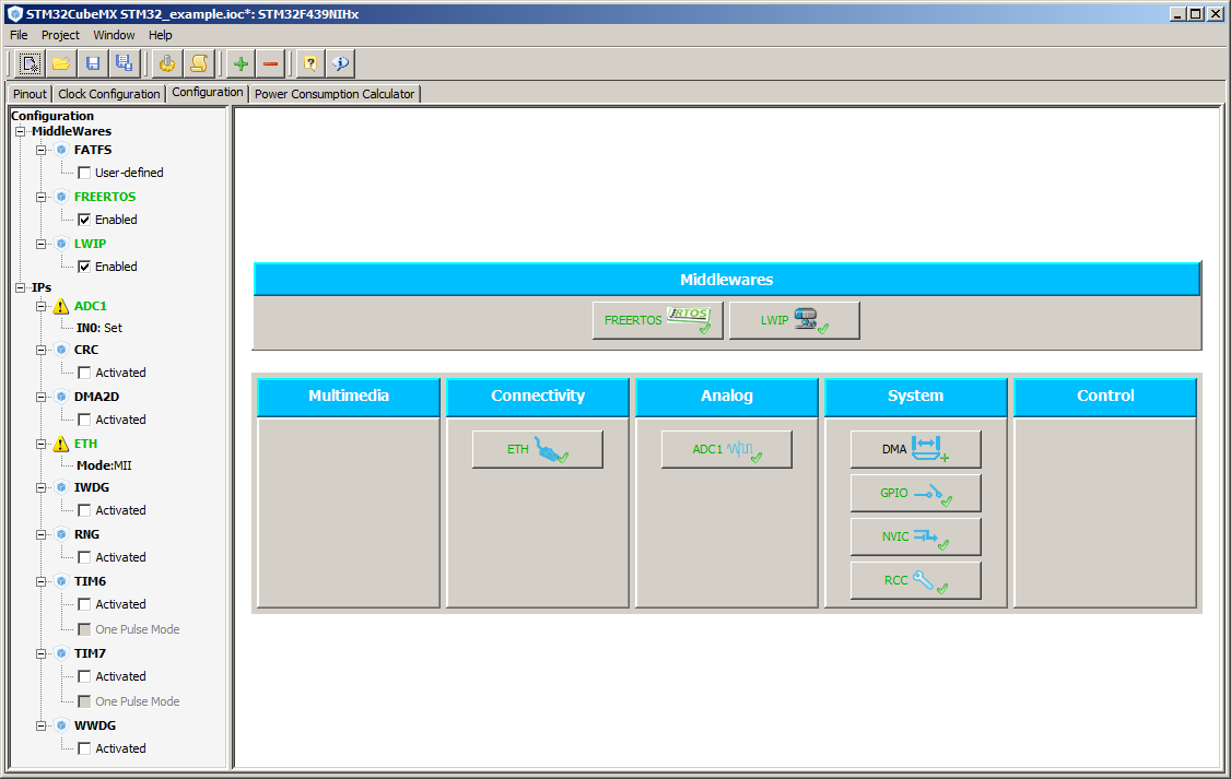 The image on the right shows the configuration tab when only the Eth and a single ADC have been selected. The first set of workflow steps below demonstrate how to use the Configuration tab to configure a hardware peripheral. The second set of workflow steps demonstrate how to use the Configuration tab to configure a software component (FreeRTOS in this case).