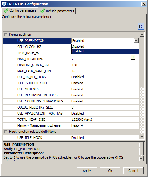The image below shows the dialogue displayed when the FreeRTOS button is pressed. One tab contains a table from which the main FreeRTOSConfig.h parameters can be set. Another tab contains a table that allows RTOS API functions to be included or excluded from the build.
