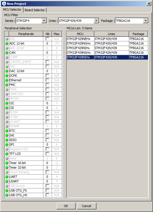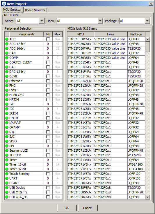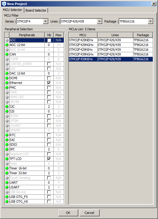 2. Select an MCU part number. The dialogue will automatically grey out the peripherals that are not available for the selected part.